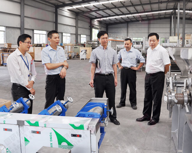 李局長一行來到公司就深入車間了解生產(chǎn)情況,在河粉機(jī)裝配車間李局長詳細(xì)詢問了河粉機(jī)的功能原理和價格,當(dāng)?shù)弥獓信坪臃蹤C(jī)占領(lǐng)了國內(nèi)主要市場時十分高興。李局長一行還在公司黨支部活動室觀看了廣州電視臺播出的報道我司開展黨建工作的《紅棉璀璨》專題節(jié)目,隨后開展了討論,對我司黨建工作開展的有聲有色給予了高度評價。