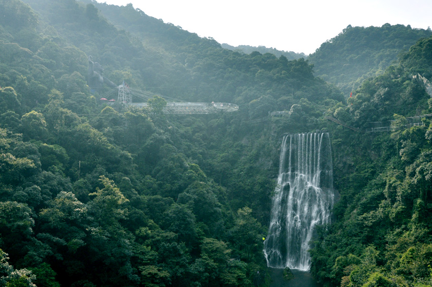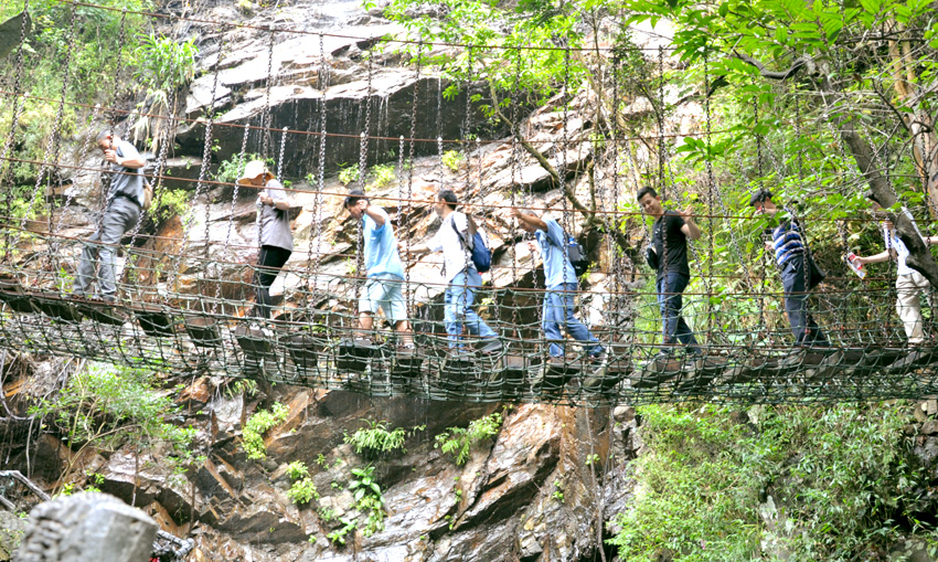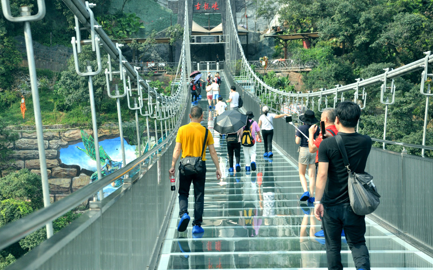 兩小時的小北江之游,大家都還余味未盡。導(dǎo)游又帶上大家趕往這次團建活動的重頭戲的目的地:古龍峽的“云天波霸”。今天公司參加團建的所有員工都要挑戰(zhàn)目前世界上較寬的高空玻璃橋,玻璃橋像一條通體透明的巨龍連接著峽谷兩岸,橋下懸空超過100米,站在橋上向下看,真是令人心驚膽戰(zhàn),大家相互鼓勵,三三兩兩牽手前行,用相互的關(guān)愛順利通過并成功抵達世界較大直徑的懸空玻璃平臺。盡管大家都汗流浹背,但每個人臉上都洋溢著喜悅。因為此時大家都收獲了克服恐懼心理后戰(zhàn)勝困難的勇氣和成功!