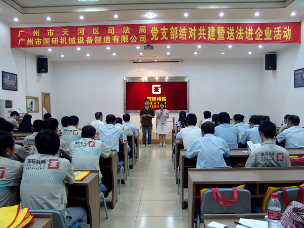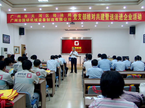 9月7日下午,廣州市天河區(qū)司法局黨支部和文教工作隊一行18人在局長羅育輝和副局長曾曉云的帶領(lǐng)下,來到廣州市國研機(jī)械設(shè)備制造有限公司舉行黨支部結(jié)對共建暨送法進(jìn)企業(yè)活動。