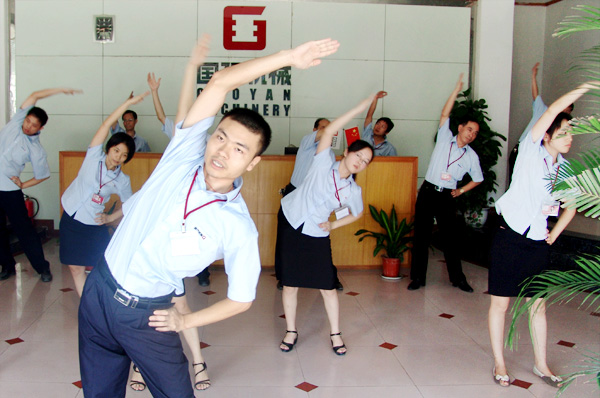 每天早上8:30,隨著公司團(tuán)支部書記李運(yùn)喜一聲哨響,健身活動正式開始!全體員工迅速集合,不到兩分鐘,就在健身場地排起了整齊的隊伍,一個個精神抖擻、神采奕奕。體育專業(yè)出身的團(tuán)員青年朱承容,站到隊伍前列給大家當(dāng)教練。公司高管帶頭參與,大家整齊劃一練起來?!暗谝还?jié),頭部運(yùn)動,一二三四五六七八…… “教練”認(rèn)真,“學(xué)員”用心,整個健身場面生動、氣氛活潑、積極向上。
